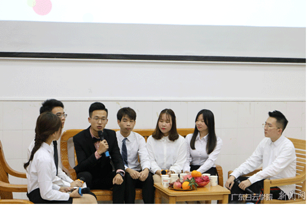 在欣赏完幽默又青春四溢的街坊视频后,来自各个学院的优秀学生代表上台向我们介绍自己的经历与经验。首先上台是机电工程学院2015级东东数码创始人之一徐皎。他介绍了他的创业经验,并鼓励大家要不忘初衷,继续前行。紧接着由会计学院2015级审计学班国家励志奖学金获得者陈霞玲介绍了学校手语队,展现了手语的温暖,并向同学们提出“只有变得更加优秀,才不会辜负自己”的忠告。随后,艺术设计学院2016级攀岩俱乐部会长柯志喜通过自己的亲身经历告诉同学们在大学要平衡好学习与兴趣,找到自己喜欢的事并为之付出努力。会计学院2015级审计学班阳光先锋队队长古思婷告诉大家要摆正心态,相信自己,并和大家分享了她参加志愿者活动的心得体会。应用经济学院学院2016级十大歌手亚军获得者吴泽锐讲述了自己锲而不舍追逐音乐梦想的经历,青春在身,梦想在侧。接下来,进入了座谈会环节,该环节中由主持人问优秀学生回答。在此环节中,五位优秀学生代表虽对问题有不同的见解,但从他们的回答中,不难看出他们无不以乐观积极的态度面对生活中遇到的难题,笑对生活。在此之后,肖华老师作出了嘉宾总结。她肯定了优秀学生的能力,指出该活动提高了同学们对大学生活、甚至日后生活起到了重要作用,有利于鼓励同学们积极应对生活难题,培养同学们顽强拼搏、坚韧不拔的崇高精神,并希望同学们对未来有所规划,能够合理安排自己的大学生活,对大家寄予仰望星空,脚踏实地,在白云绽放自己梦想的厚望。