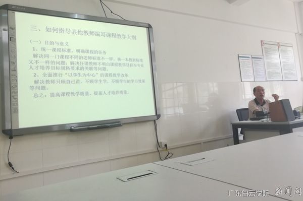 教务处教授刘诗安系统地讲解了教学大纲的编写要点和注意事项,重点解释了课程描述、课程目标与专业人才培养规格的相关性、教学安排以及课程考核方案等项目的编写方法。 专题讲座后,教师与刘教授进行了互动,刘教授对教师们提出的问题一一给予解答,赢得了教师们阵阵的掌声。
