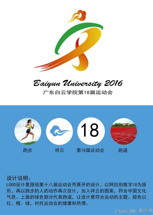 校园运动会是我校传统节日,会徽是传播和体现运动会文化的重要载体,每一届的运动会会徽都代表着不同的活动理念,对于宣扬运动会主题思想有着至关重要的作用。广东白云学院第十八届运动会会微设计选用了B14视觉传达设计专业卓映芬同学的设计方案,此方案十分契合本次运动会活动主题,以“努力拼搏,放飞梦想”理念展开会徽设计,设计方案体现了本届校园运动会的精神内涵,宣传了广东白云学院办学理念及品牌形象,获得师生一致认可和社会大众的广泛好评。