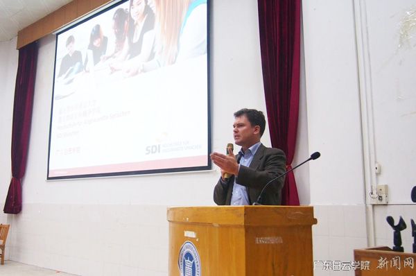 沈根生副校长为本次活动致辞,他介绍了外国语学院、国际学院的中德国际合作项目,鼓励学习外语的各位学生能走出国门,努力成为现代社会所需要的新型人才,一场慷慨激昂的演讲激起了在场同学们的热情。Dr.Andrew Williams向同学们介绍了慕尼黑应用语言大学的概况,也表达了他对此番来广东白云学院进行交流学习的热情及肯定,并通过演示文稿和一段精彩的视频向同学们介绍了慕尼黑应用语言大学的住宿学习环境,随后Dr.Andrew Williams和李冰老师与观众的互动更是带动了活动的气氛。