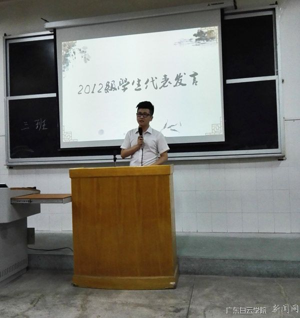 接着,2012级学生代表陈耿晋同学发言。踏入企业实习一年的陈耿晋师兄显得格外成熟和自信,用响亮的声音与同学们分享了企业实践学习心得,希望同学们勇于实践,敢于实践,让理想职业从白云起步。会议第四项,2013级学生代表沈晓珊同学发言。沈晓珊同学用简洁的语言概述了本次企业实践教学动员大会的感想,表明了自己对于企业实践学习的态度,号召全体同学将理论与实践相结合,认真参与实习。