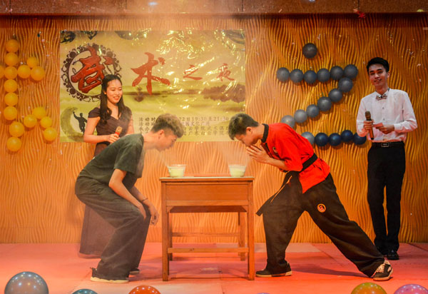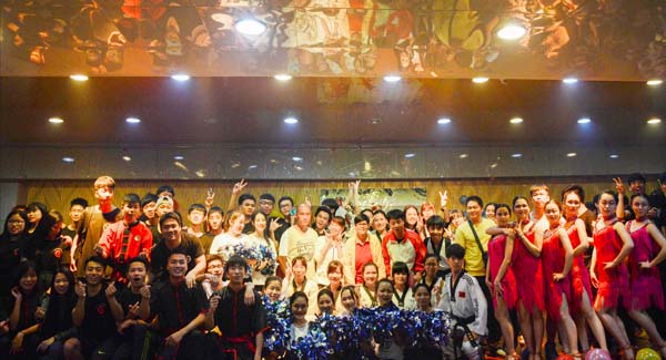 活动中,学校龙狮团带来的开场舞《群师贺武夜》让人眼前一亮;武术协会进行了截拳道、太极、武跆、咏春、双截棍等表演有板有眼、虎虎生威,让观众领略了武术的魅力;作为表演嘉宾的啦啦队、交谊舞协会、汉服协会也表演了《Don’t telephone me》、《铁血丹心》、《雨过昔年》等节目,形式多样,内容丰富;现场还安排了很多和观众互动的小游戏,极大程度地激发了观众的参与兴致。现场气氛热烈,观众热情高涨。