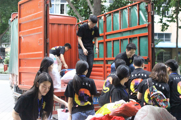学生工作人员将衣物装上车