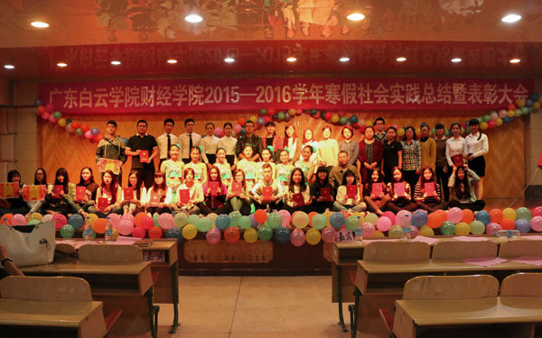 大会在庄严的校歌中拉开帷幕。财经学院党总支副书记龙晓凤宣读了《关于广东白云学院财经学院2015-2016学年寒假社会实践总结表彰决定》,宣布授予刘婉仪等4名同学优胜奖;授予黄飞蓉等4名同学一等奖;授予卢玉冰等8位名同学二等奖;授予李思慧等12名同学三等奖;授予2014级会计学1班等5个班级“最佳组织奖”。