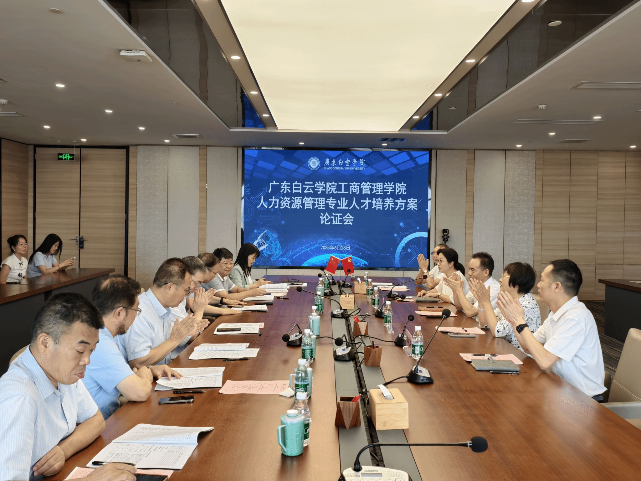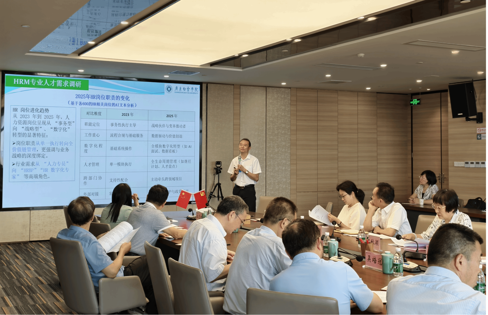 会议邀请了广东省人力资源研究会会长、华南师范大学人力资源管理专业博导、二级教授谌新民,广东省人力资源研究会执行会长、全国政协委员、民革广东省委会副主委、广东省人民政府参事、中山大学教授吴培冠,广东省人力资源研究会常务副会长兼学术委员会主任、中山大学教授、博导王晓晖,广东省人力资源研究会常务副会长兼战略决策委员会主任、暨南大学管理学院教授、博导叶茂林,广东省人力资源研究会常务副会长兼发展改革委员会主任、广东财经大学教授、原MBA学院院长李焕荣,广东省人力资源研究会常务副会长、华南理工大学公共管理学院教授、博导黄岩,广东省人力资源研究会秘书长、广东金融学院教授、硕导汪志红组成专家团队,共同把脉专业建设方向,推动人才培养与人力资源行业数智化转型深度对接。广东白云学院教务长纪秋颖,工商管理学院院领导及人力资源系全体专任教师参会。