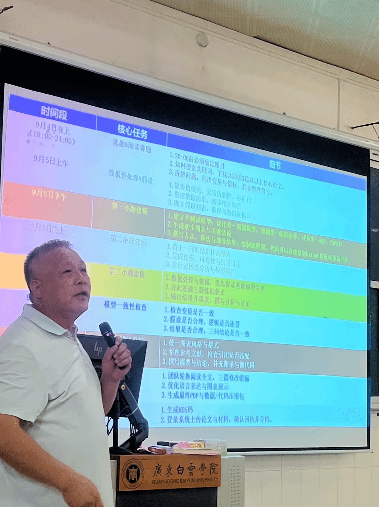 周隽主任就竞赛实操细节进行补充说明。她用时间轴形式清晰标注9月4日至7日的关键时间点,帮助参赛队伍把握比赛节奏,同时也温馨提醒各参赛队伍要及时提交论文及支撑材料,规避网络延迟风险。针对指导教师职责,她明确“赛前指导、赛中禁言、赛后总结”的三线准则,确保竞赛全程合规有序。此次培训会的举办,既对过往竞赛经验进行系统梳理,也为冲击更高奖项明确了方向。(图文/教育学院王娴 责任编辑曾进)