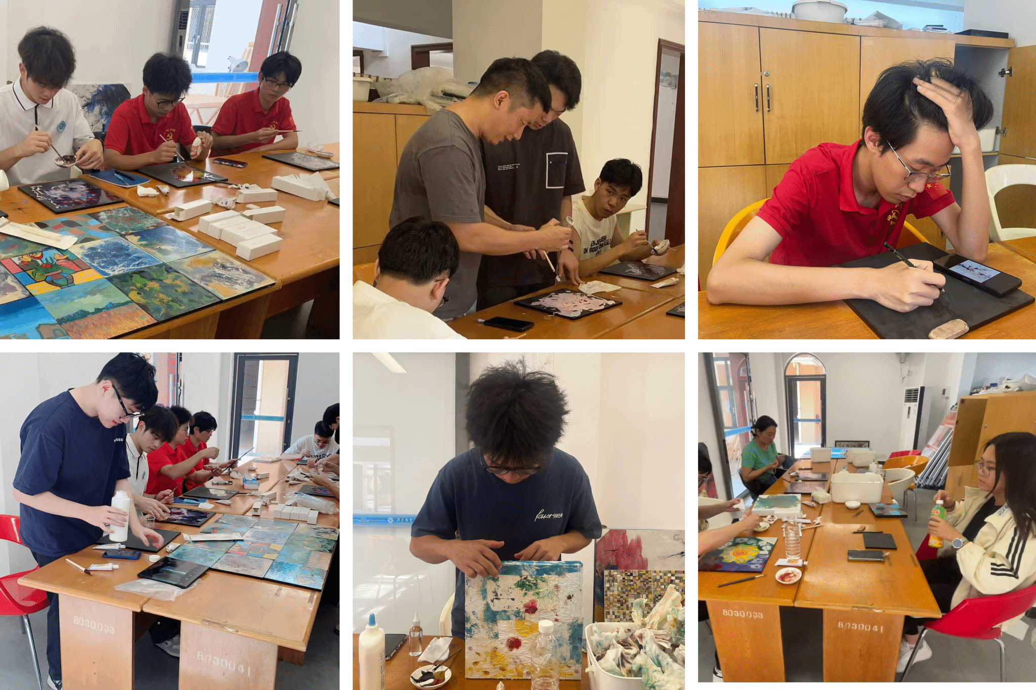 在随后的实践环节,活动现场气氛热烈而专注。同学们围绕在工作台前,根据林老师的初步讲解和个人兴趣,自主选择了尝试不同的漆画技法。有的同学专注于“镶嵌磨显”的奇妙,将预先准备好的蛋壳、螺钿等材料细心镶嵌于漆底之上,期待经过后续研磨后呈现的意外之喜;有的则大胆尝试让“调稀的漆画颜料在漆板上自然流动”,捕捉那种介于可控与不可控之间的抽象意趣,体验“道法自然”的创作境界;还有的同学偏好“直接画法”的率真,用画笔直接蘸取调配好的彩漆,在漆板上勾勒心中的图景。