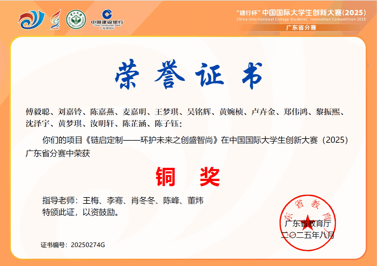 在近日落幕的2025年“建行杯”中国国际大学生创新大赛广东省分赛中,由创新创业学院牵头指导、工商管理学院创业学生引领,曙光大数据学院作为核心技术支撑参与的《链启定制——环护未来之创盛智尚》项目,荣获高教主赛道本科创业组铜奖。这一成绩充分彰显了我院在“产教融合、协同育人”方面的扎实成效。