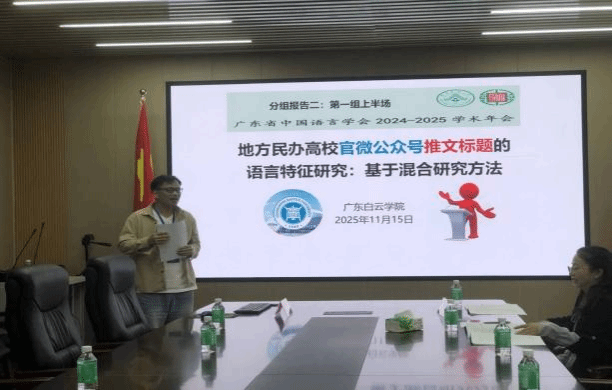 在论文发布环节,我校5位教师依次发表研究成果,展现出扎实的学术积累与创新视野。任启、张美娟、刘乐乐等合作完成的《课程思政视角下现代汉语课程教学用例探讨》一文,从课程思政角度对现代汉语课程教学用例进行了系统探讨。主持人认为选题新颖、可操作性强,值得推广。伦昕煜、刘世民、杨金彪、郑耿成四位老师也分别就以下议题作了报告:《汉语显性告知类语力的多模态表现方式》《地方民办高校官微公众号推文标题的语言特征研究》《“相对”的诗学:〈距离的组织〉再解读——兼论语言体式的跨界问题》《计算转向与范式趋同:ChatGPT发布前后的学术论文摘要对比研究》。这些论文选题视角多元、方法创新,反映出学院教师在语言本体研究、教学实践与跨学科融合等方面的持续探索,获得了年会专家的一致认同。