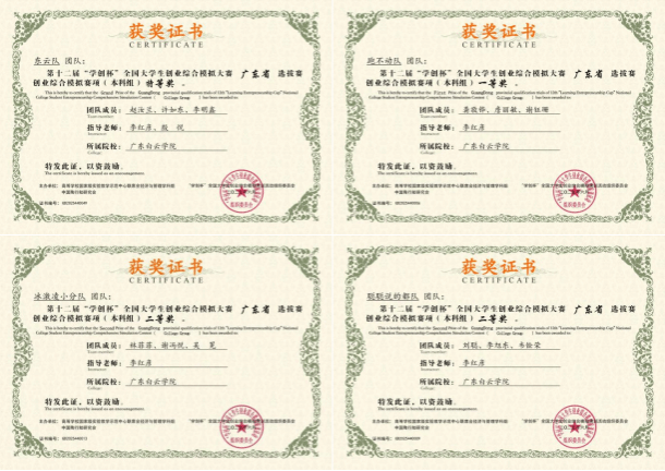 在第十二届“学创杯”全国大学生创业综合模拟大赛创业综合模拟赛项中,我校工商管理学院学生在广东省赛获得特等奖1项、一等奖1项、二等奖2项,省赛获奖数量和等级创历史新高,并且特等奖团队在国赛中获得二等奖,指导老师李红彦、殷悦老师在省赛、国赛均荣获“最佳指导教师”和“优秀指导教师”称号。