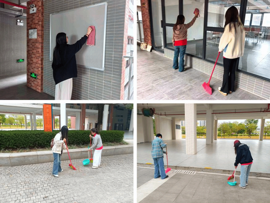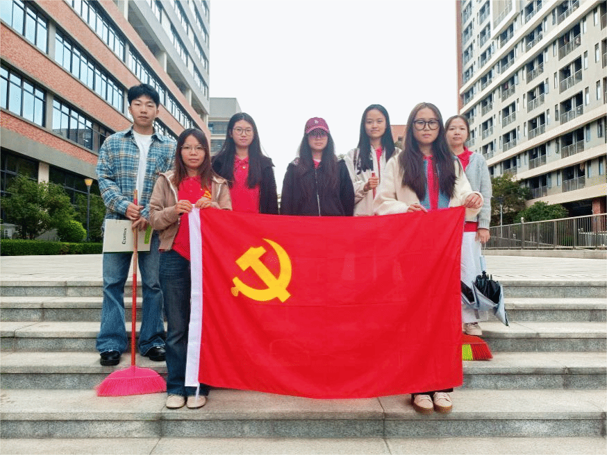 活动前期,党支部对责任区域进行科学划分,并分组安排党员和积极分子的任务。活动伊始,各小组便携带扫帚、簸箕、垃圾袋等清洁工具,精神抖擞地奔赴各自负责的区域。负责白云楼楼下及周边公共区域的组员们扫净主干道落叶、排干积水,清走绿化带里的零食袋与枯枝;负责教学楼内卫生的组员们擦去窗台、宣传栏的积灰,连角落的蛛网碎屑也逐一清理。分工协作间,分散的力量被拧成“一股绳”,既加快了清理进度,更让“支部一盘棋”的凝聚力落地见效。