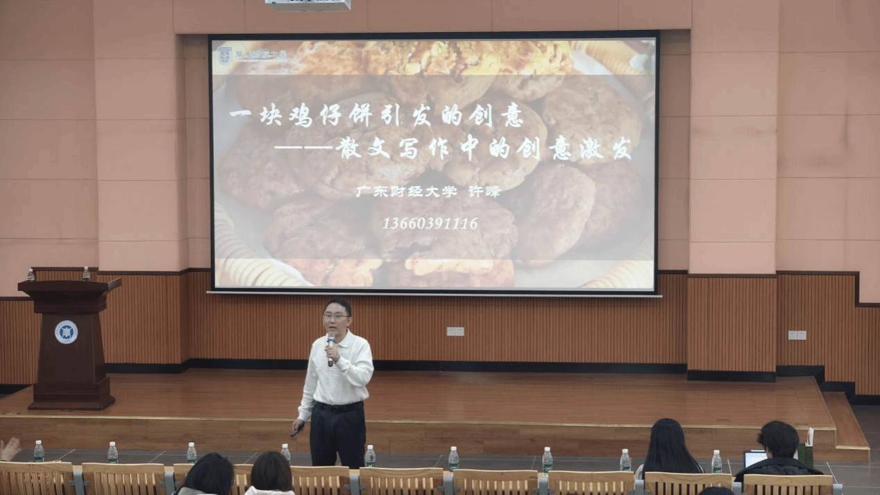许峰教授从一块“鸡仔饼”这一充满生活气息的微小切口引入,首先探讨了散文写作“写什么”的根本问题。他说,在中文系的写作教学中,不仅要引导学生关注宏大的叙事,更要珍视那些源自日常生活的、鲜活的个人经验与生命感悟。正如“鸡仔饼”所象征的,我们身边的点滴事物,皆可成为散文书写的素材,关键在于培养学生发现与感知的能力。