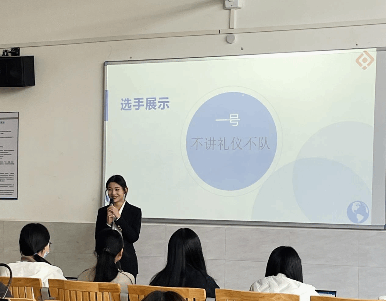比赛环节:参赛选手展示商务礼仪实践作品,以及评委老师点评,评委老师根据作品提出商务礼仪知识的相关问题,选手现场竞答。选手们在现场侃侃而谈,展现良好的大学生礼仪文明风貌!
