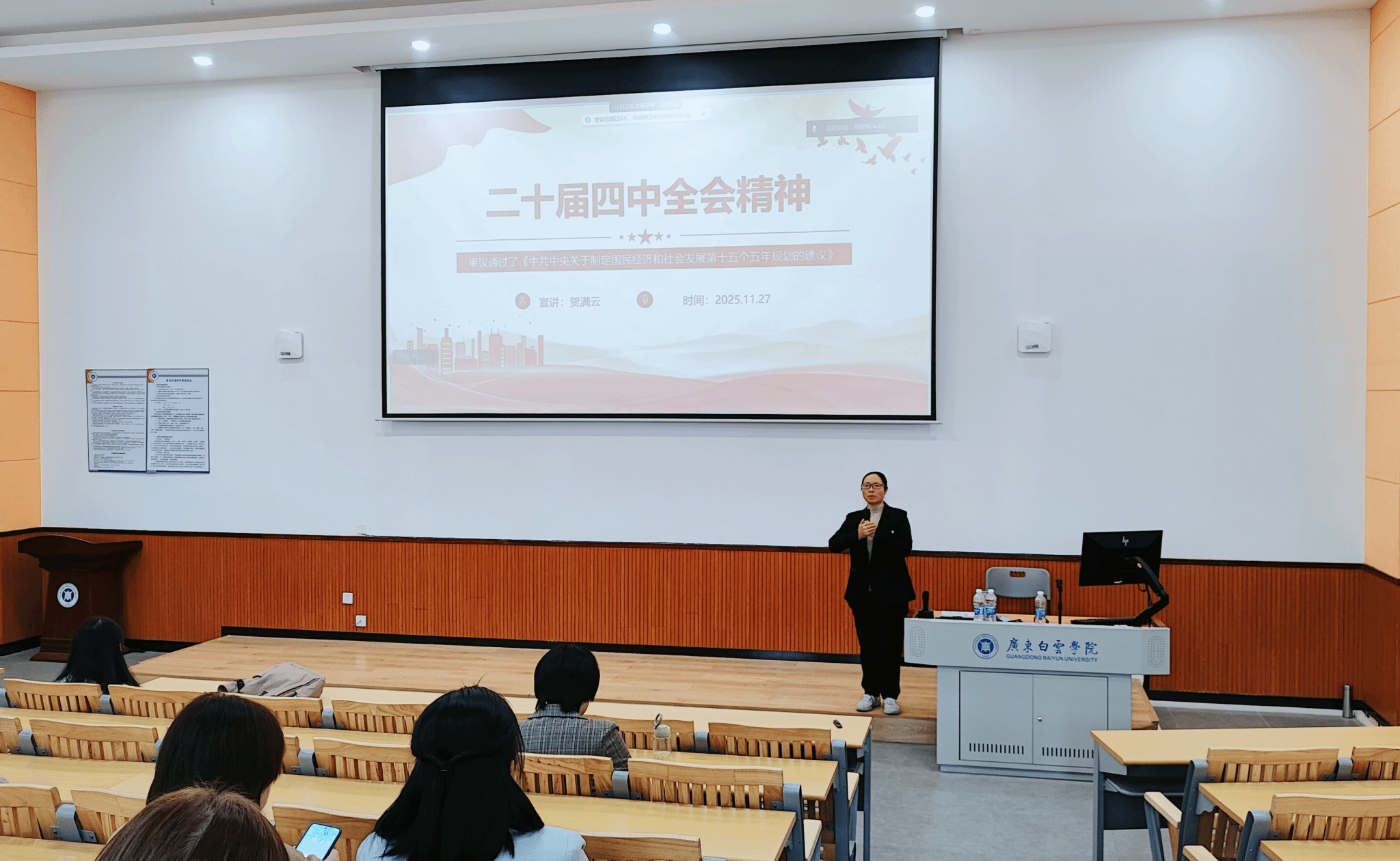 11月27日,外国语学院教职工党支部在励学楼405召开党员大会,专题学习党的二十届四中全会精神。学院党委书记贺满云主讲,全体教职工党员参加。