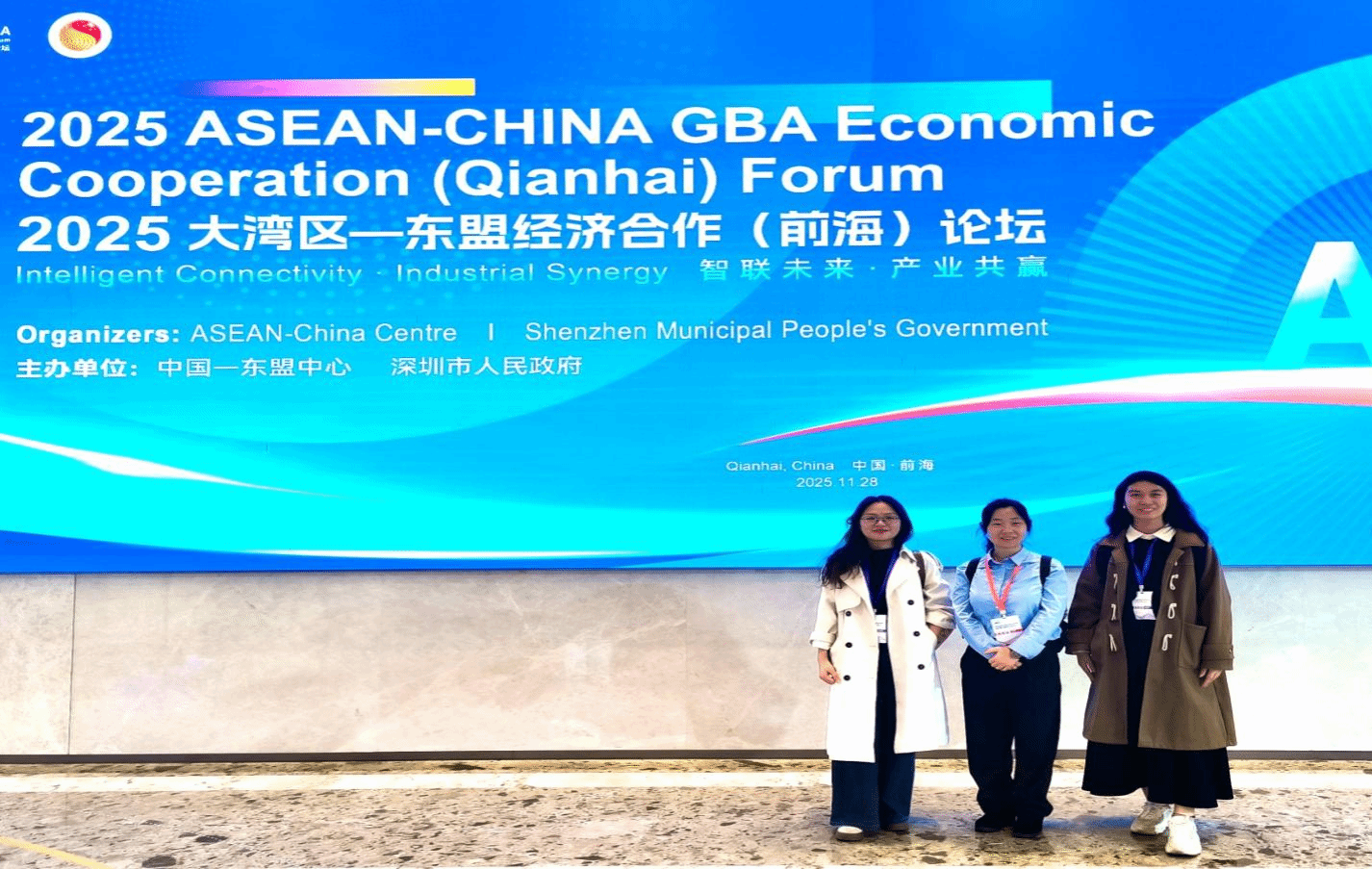 11月28日,应用经济学院国际经济与贸易系余艳炯、欧阳明荟、王懿轩三位教师代表参加以“智联未来·产业共赢”为主题的2025大湾区—东盟经济合作(前海)论坛。