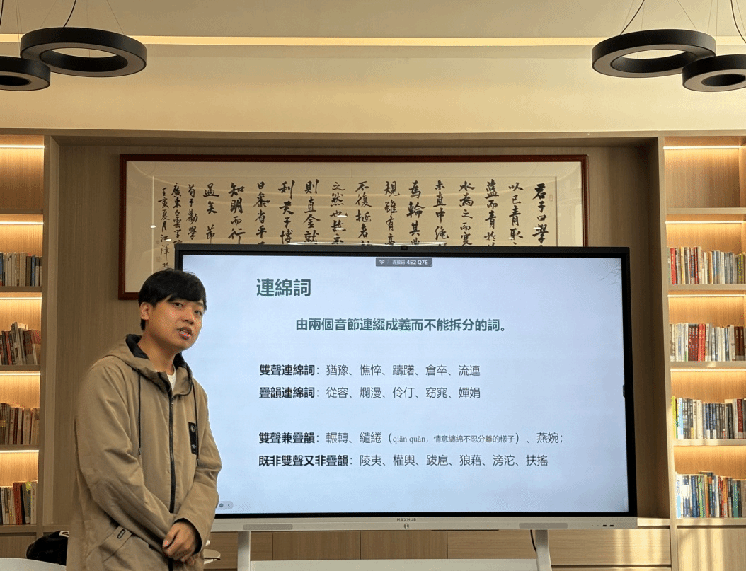 本次活动主讲人是青年教师郑耿成,他首先定义了什么是“联绵词”,并对“《诗经》中的双声联绵词”作出分类;随后以《诗经·豳风·七月》的“觱发”一词提出两个问题:一是“觱发”的“发”为何读作bō而不是fā?另一个是“觱发”的词义及其来由是什么?