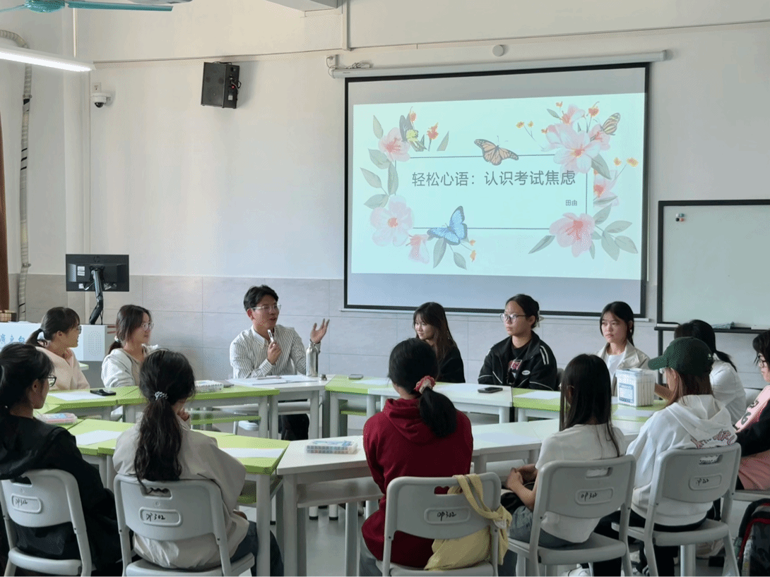 活动伊始,田由老师以亲切和蔼的自我介绍拉近了与同学们的距离,并随后巧妙地以一场别开生面的热场游戏打破初见的拘谨。同学们围坐成圈,在田由老师有序地引导下,积极参与“依次报数”破冰游戏。当数字中包含7或是7的倍数时,需迅速以拍掌代替报数,错报者则大方地向大家进行自我介绍。游戏过程中,欢声笑语此起彼伏,原本因陌生而产生的紧张感如春日薄雾般悄然消散,焦虑的情绪也在这一来一往的互动中得到了初步释放。这一环节不仅为活动营造了轻松愉悦的氛围,更为后续深入“认识考试焦虑”主题筑牢了温暖的基石,让同学们能够以更加开放和放松的心态投入到后续的探索中。