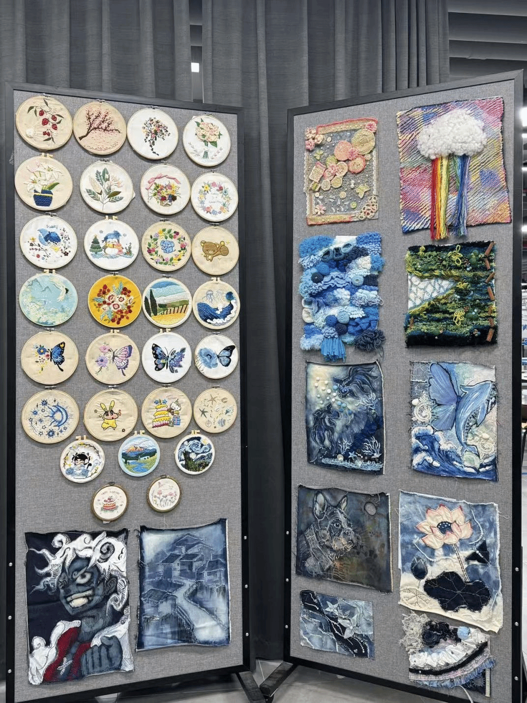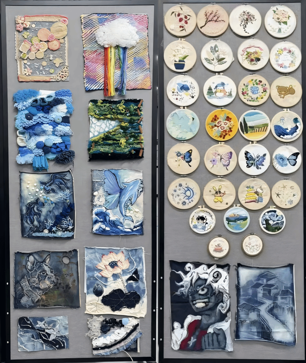 刺绣作品单元中,学生们巧妙运用多种传统刺绣技法,在面料上营造出丰富的肌理与视觉层次,将东方美学与现代设计语言巧妙结合,创造了富有层次感和故事性的面料艺术品。
