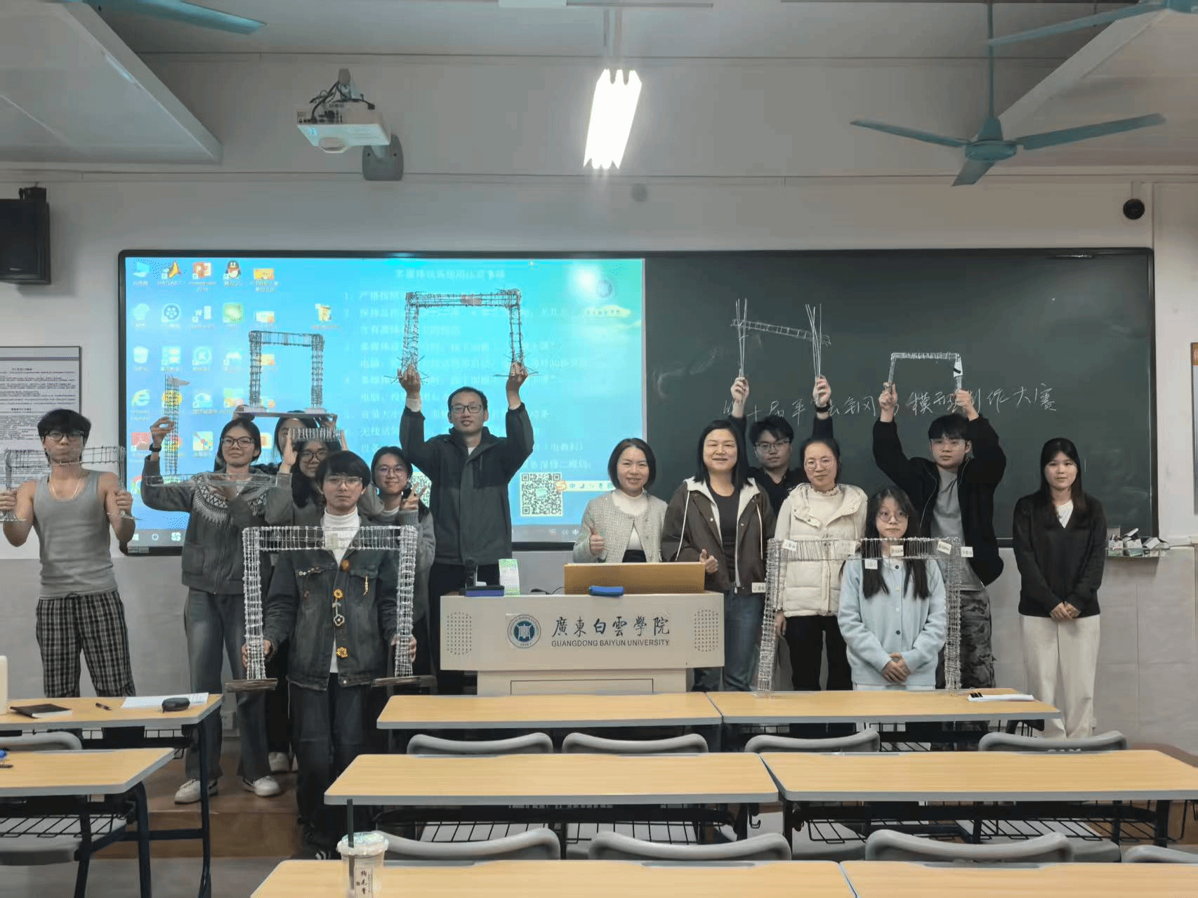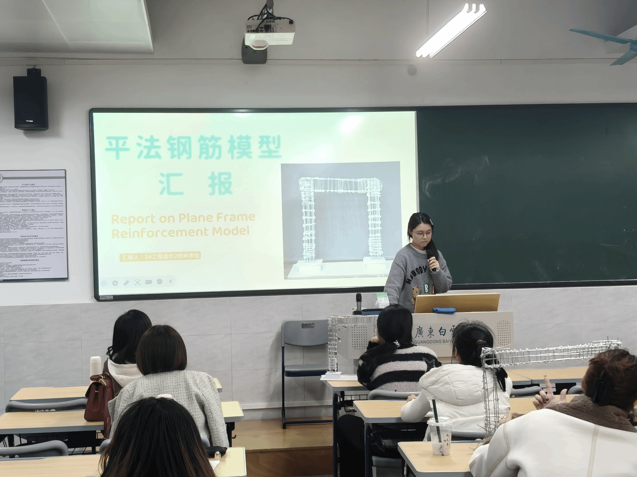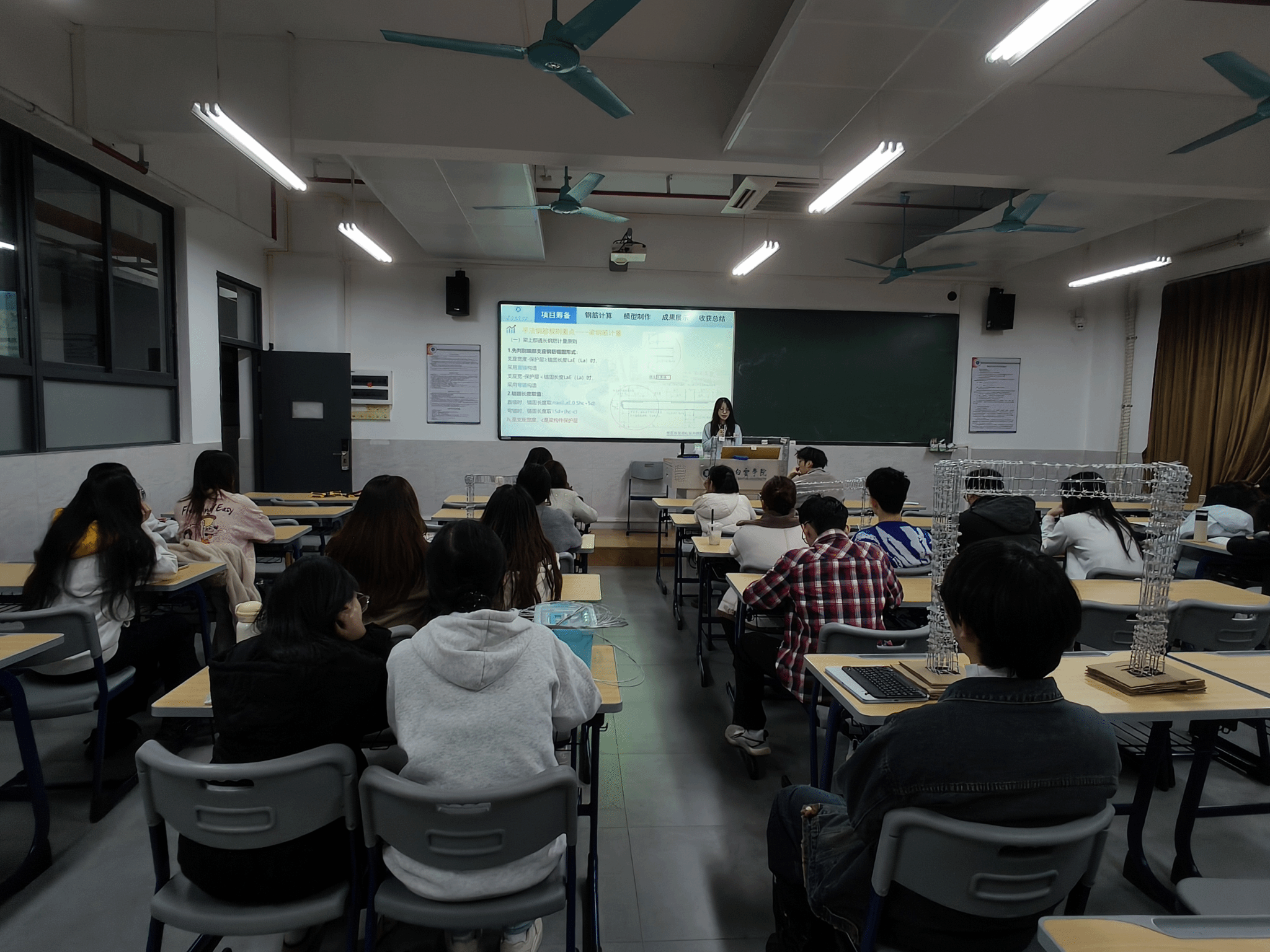 本次大赛自启动以来,得到了同学们的积极响应。各参赛队伍从赛题发布后便全身心投入,在兼顾期末学业压力的同时,利用课余时间反复钻研图纸、精准计算数据、精心搭建模型,在一次次调整与优化中攻克技术难题,充分展现了顽强拼搏、永不言弃的进取精神。比赛现场,各队伍依次进行 PPT 汇报与模型展示,汇报内容涵盖图纸解析、计算过程、制作总结等核心环节,汇报人从容自信、逻辑清晰;参赛模型制作规范、细节考究,充分体现了同学们扎实的专业知识和出色的动手能力。