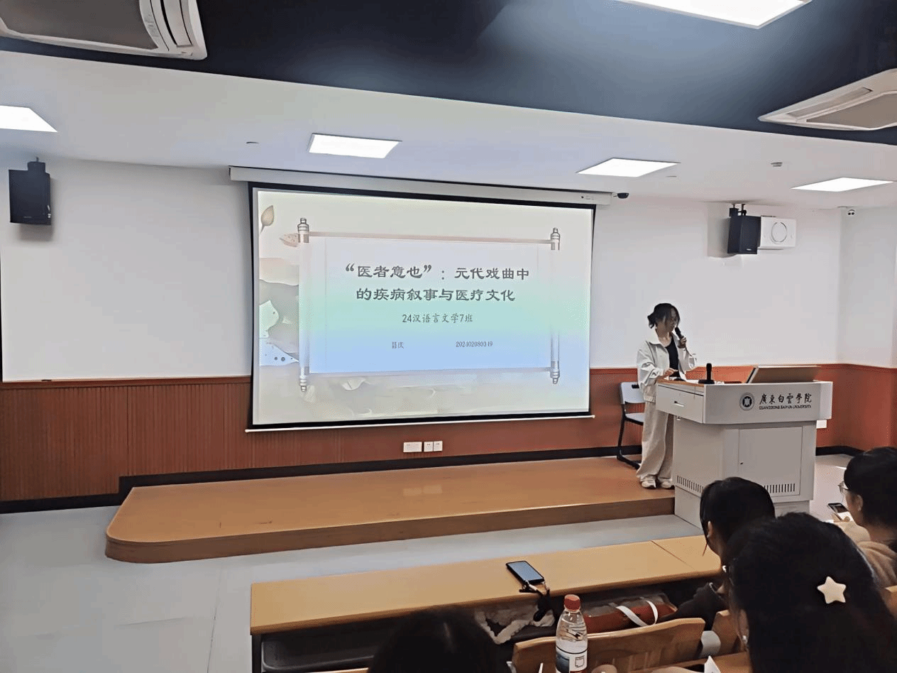在“文脉流芳,经典品汇”中国古代文学经典研读论文写作大赛活动现场,14位一等奖论文获得者向同学们分享写作心得。其中,2024级汉语言文学7班聂庆的《“医者意也”:元代戏曲中的疾病叙事与医疗文化》,以“医者意也”为理论框架,系统分析了元代戏曲中的疾病叙事及其背后的医疗文化内涵。疾病在元杂剧中不仅是情节推动、人物塑造的工具,更是社会批判与文化隐喻的载体。文章通过对《西厢记》《窦娥冤》《汉宫秋》等作品的分析,揭示了疾病如何象征知识分子失意、社会道德溃烂等时代症候;同时,通过对医者形象、诊疗方式、医药意象的考察,展现了元代儒医不分、巫医并存的多元医疗文化图景,以及文人对精神救赎的追求。