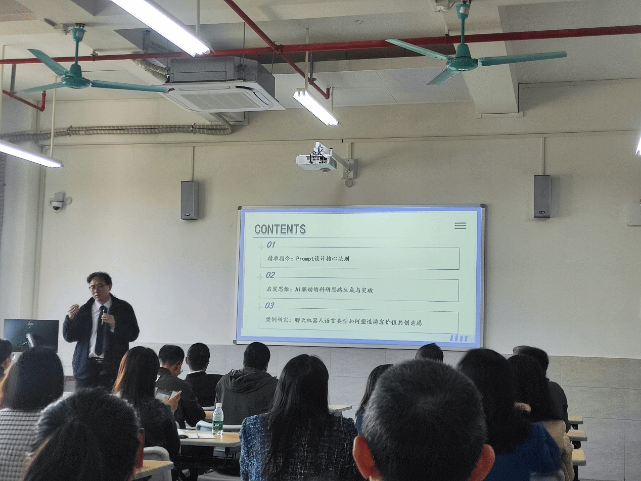12月18日下午,华南师范大学博士生导师李军教授应邀来到工商管理学院,为学院领导及“双精计划”参与教师带来了一场主题鲜明、内容前沿的学术讲座。讲座以“从前瞻探索到成果表达:‘十五五’背景下的前沿选题、智能实验与精准写作”为核心,深度聚焦人工智能时代下的科研范式变革与能力提升。