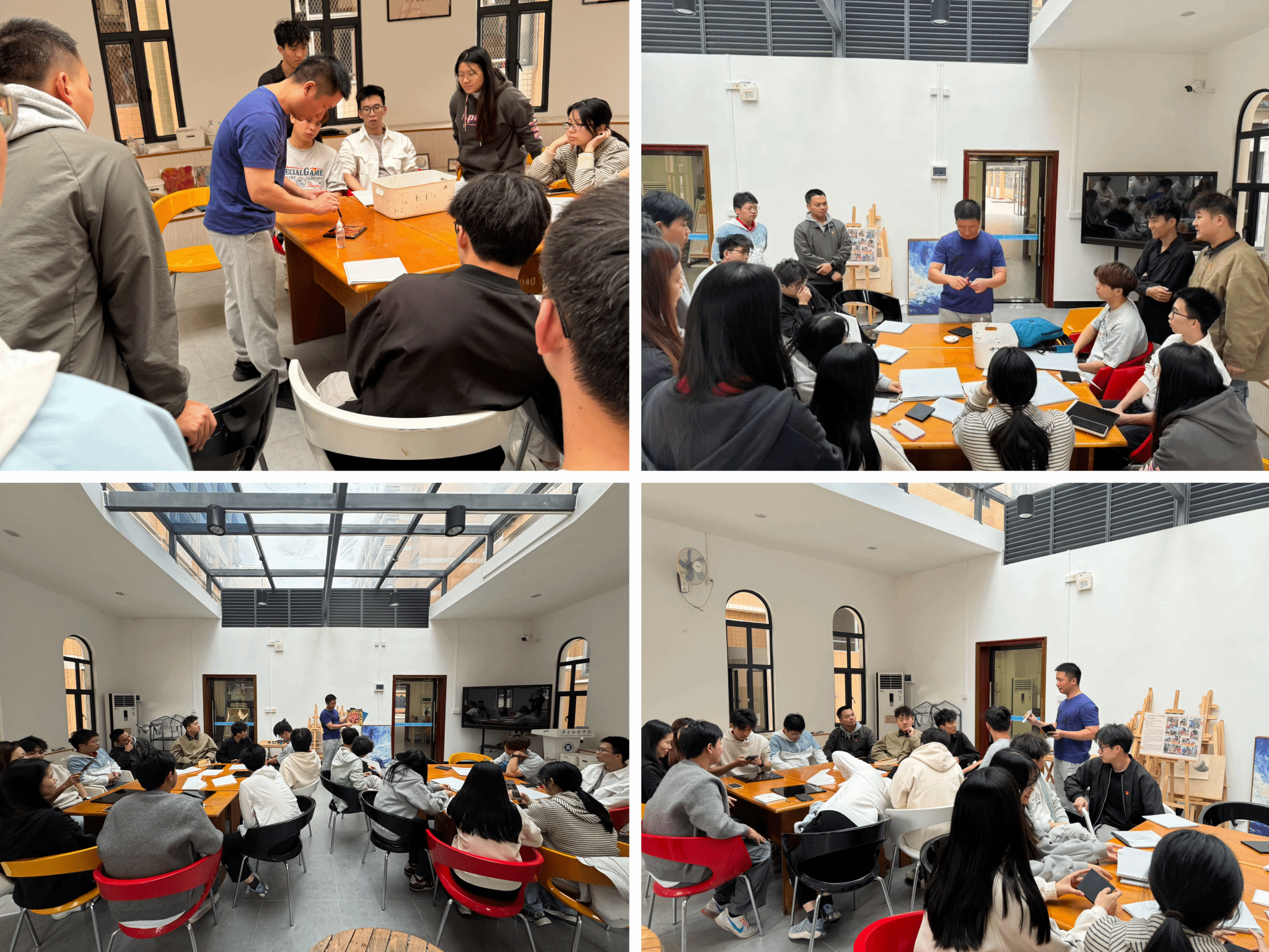 本次活动的最大亮点在于创造性地引导同学们打破学科壁垒,尝试将各自的专业逻辑与艺术创作相结合。老师鼓励大家从电路图的严谨排布、编程代码的逻辑结构、数学公式的简洁优美中汲取灵感,将其转化为绘画中的构图思路、线条语言或符号元素,并融入漆画创作。这一倡议极大地激发了同学们的创作热情与思维活力,大家纷纷围绕“初心”“探索”“融合”等主题进行构思。