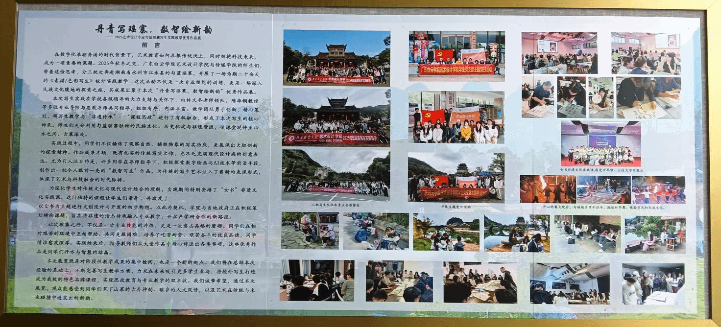 此次瑶寨之行,不仅是一次专业技能的淬炼提升,更是一场意志品格的磨砺考验。同学们在相对艰苦的实践环境中互帮互助、携手前行,共同克服种种困难,砥砺了吃苦耐劳、艰苦奋斗的优良品格,同学情谊也在朝夕相处中愈发深厚。本次展览既是对学院校外实践教学阶段性成果的集中检阅,更是推动艺术教育创新发展的全新起点。未来,学院将全面总结本次实践经验,持续完善写生教学方案,着力将校外写生打造成学校特色品牌课程,实现思政教育与专业教学的同频共振、双融双促。我们诚挚期盼,每一位观展者都能从作品中领略到瑶寨的古朴神韵、瑶乡的人文风情,感受传统艺术与现代科技碰撞交融所迸发的独特新韵。(图文/艺术设计学院林文冬 责任编辑曾进)