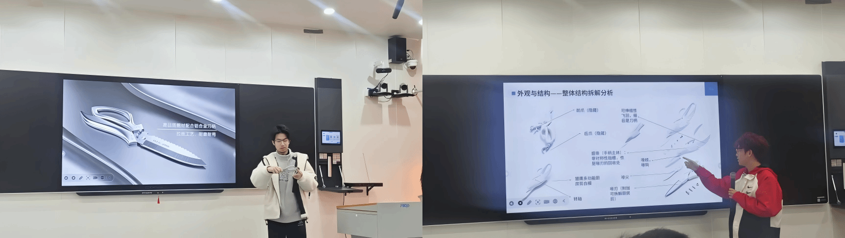 本次大赛的企业评审团阵容专业强大,由精诚智科技总经理林爱彬、产品经理邱锦炫、产品部主管陆应健、设计师吴锦扬及陈桂苗组成。评审过程中,专家团结合自身丰富的行业实战经验与市场发展趋势,从产品市场化潜力、工艺可行性、用户体验优化等核心维度,对参赛作品进行细致考评,并针对设计细节向同学们提出专业提问与改进建议。答辩现场互动频繁、思维碰撞激烈,同学们在与企业专家的深度交流中,不仅明晰了设计与市场的衔接要点,更收获了极具价值的行业经验,为未来职业发展筑牢基础。