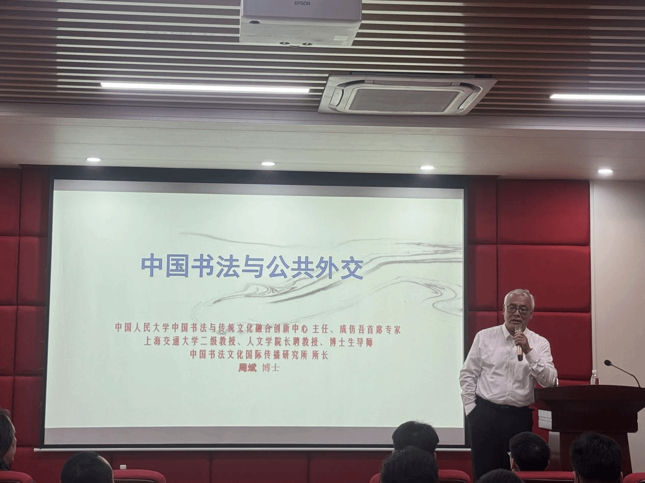 周斌教授以跨文化、跨学科的视野,阐释了中国书法作为中华文明核心载体的独特价值,指出其是推进世界文明互鉴的重要文化纽带,新时期汉字书法教育在中华文化国际传播与公共外交中发挥着不可替代的作用。他结合实践案例,为提升当代大学生中华文化传播与公共外交能力提供了切实可行的路径,鼓励师生以书法为媒讲好中国故事。