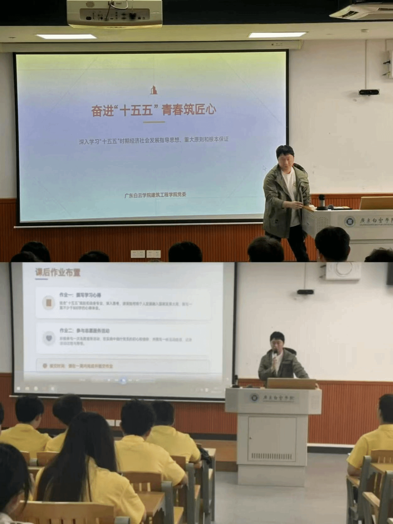 为深入学习贯彻“十五五”时期相关规划部署精神,引导建筑工程学院学生党员明晰时代使命、锤炼专业匠心,自觉把个人成长发展融入国家建设和行业发展大局,2026年3月19日下午,建筑工程学院党委在明德楼403教室开展“奋进‘十五五’,青春筑匠心”联合主题党课活动。本次党课由学生第五党支部书记兼组织员吴昊主持,学院党委书记肖华、党委副书记王文娟共同授课,学院全体学生党员参加活动。
