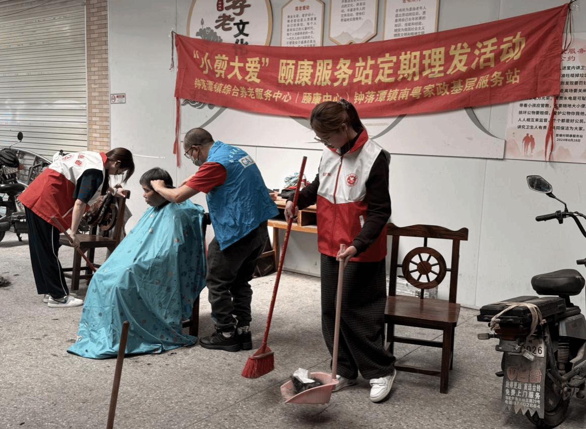 第三组志愿者前往登塘村颐康服务站,开展“小剪大爱”敬老暖心服务。志愿者们协助理发师为老人修剪头发,主动打扫服务站环境卫生,还陪老人们聊天谈心、倾听生活点滴,用真诚陪伴传递温暖关怀,让老人们真切感受到青年学子的爱心与敬意。