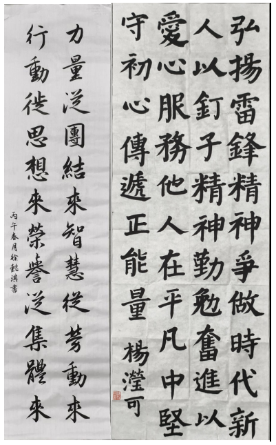 本次比赛以传承和弘扬雷锋精神为核心主题,明确鼓励学生围绕雷锋日记摘抄、雷锋名言警句,以及歌颂雷锋精神的原创诗文、经典篇章进行书法创作。活动开展期间,同学们主动深入研读雷锋事迹、感悟雷锋精神,以笔为媒、以墨为情,将对雷锋同志的敬仰与缅怀,凝于笔端、落于纸上。其中,硬笔作品工整清秀、端庄规范,字里行间彰显着学子们的严谨与真诚;软笔作品遒劲洒脱、墨韵悠长,笔墨之间传递着青年一代的气度与深情。每一笔勾勒都承载着对榜样的敬意,每一纸墨香都诉说着新时代青年的责任与担当。经过评委组从主题契合度、书写技法熟练度、艺术表现力等多个维度的严格评审、综合考量,最终评选出一等奖、二等奖、三等奖及优秀奖若干名。