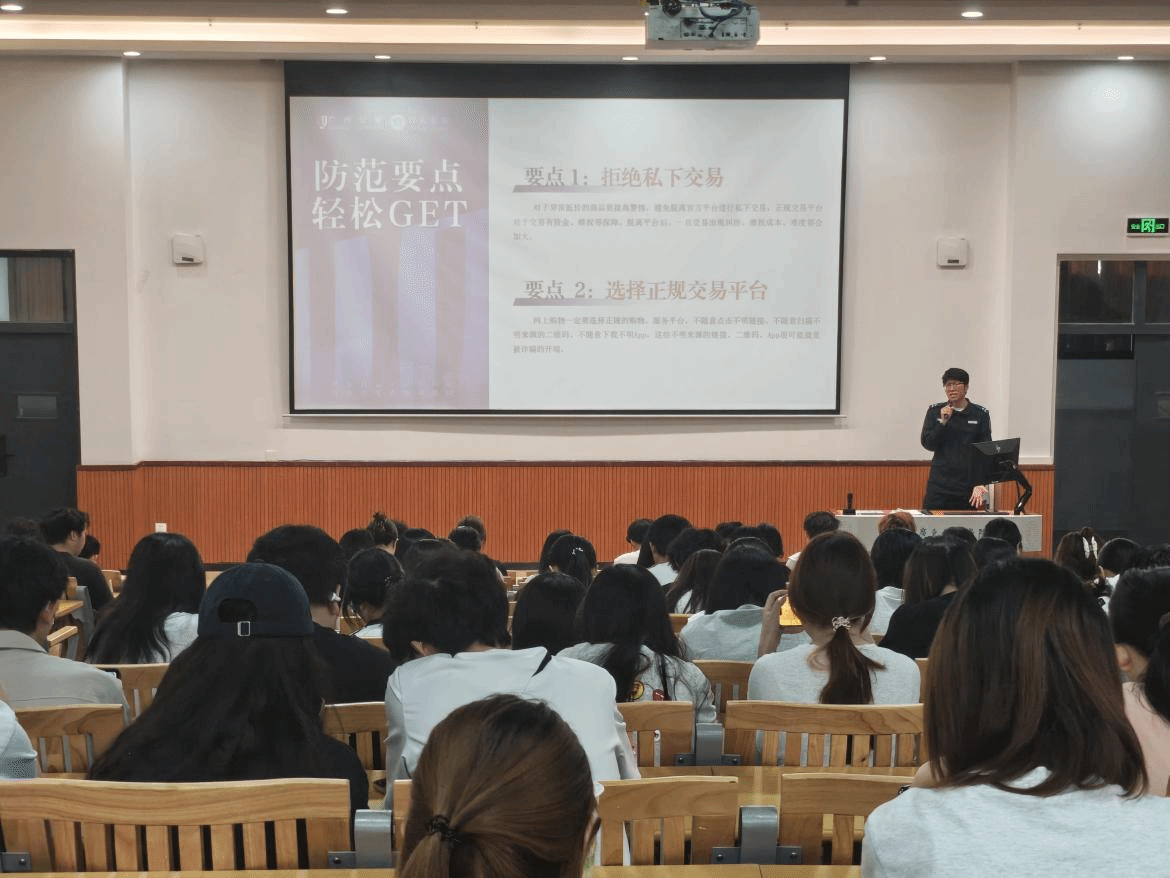 讲座现场,钟落潭派出所防诈专员强调,当前电信网络诈骗手段翻新,专门针对大学生经验不足、防范意识弱等特点设下骗局。专员用PPT展示近期高校高发的电信网络诈骗手段,如“虚假兼职刷单”“代练代打”“退款理赔”“校园贷”等,同时结合广州高校真实案例剖析作案流程和诱导话术,让学生感受诈骗就在身边,提高识别能力。此外,专员还结合案例拆解了骗子的核心套路,他们往往先伪装身份发诱人信息吸引学生,再发陌生链接、二维码诱导操作致学生泄露支付信息或转账,最后利用学生心理恐吓逼迫转账。对此专员给出系列防骗准则:不点陌生链接;正规交易走官方平台,拒绝私下转账、扫码;不信征信威胁;不外泄个人信息;遇骗及时报警,保留证据,拨打110并联系学校保卫处备案。