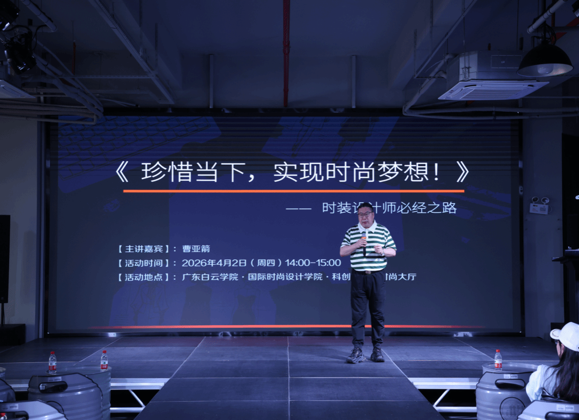 2026年4月2日下午,国际时尚设计学院于科创时尚大厅举办《珍惜当下,实现时尚梦想!——时装设计师必经之路》主题讲座。本次讲座特邀国家一级服装设计高级技师、全国技术能手、深圳市欧纺服装研究院副院长曹亚箭老师担任主讲人。国际时尚设计学院院长王家馨、副院长郭艳、杨旭,以及各专业教师及全院服装设计专业学子到场聆听学习。