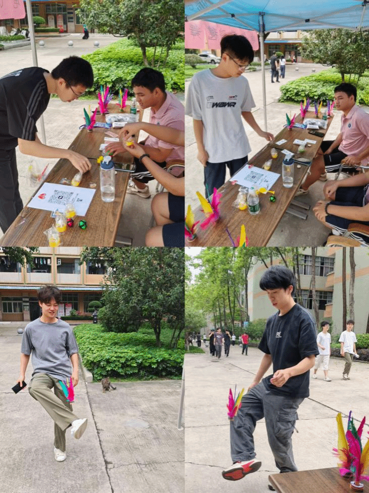 在体验区,同学们热情高涨,纷纷拿起毽球尝试。有的同学虽然是第一次接触毽球,但在工作人员的指导下,很快就掌握了基本要领,能够连续踢上几个;有的同学则是毽球爱好者,他们娴熟的技艺引来阵阵喝彩,只见毽球在他们的脚尖、膝盖、脚背之间灵活地跳跃,尽显“高手”风范。