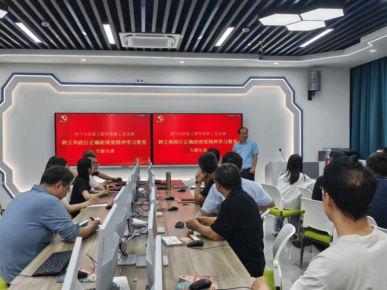 2026年4月9日下午,电气与信息工程学院教工党支部组织开展“学习习近平总书记关于树立和践行正确政绩观重要论述”专题党课学习。专题党课旨在引导全体教工党员筑牢思想根基、锤炼务实作风,将正确政绩观内化于心、外化于行。党课由党支部书记张永棠主讲。