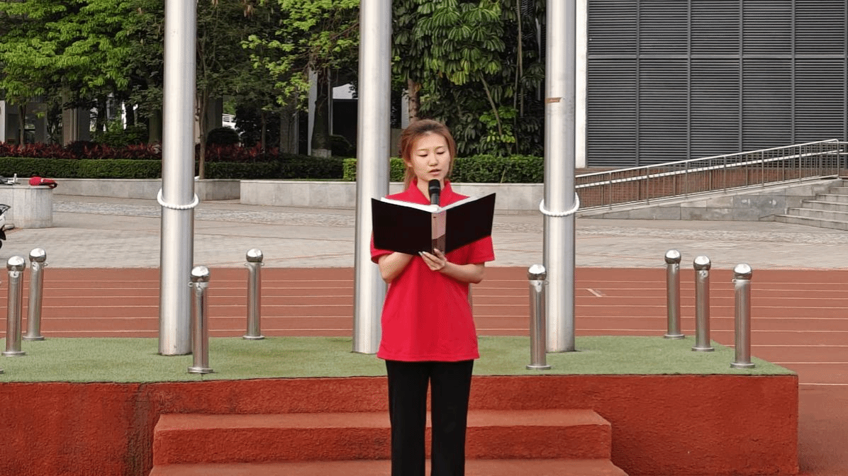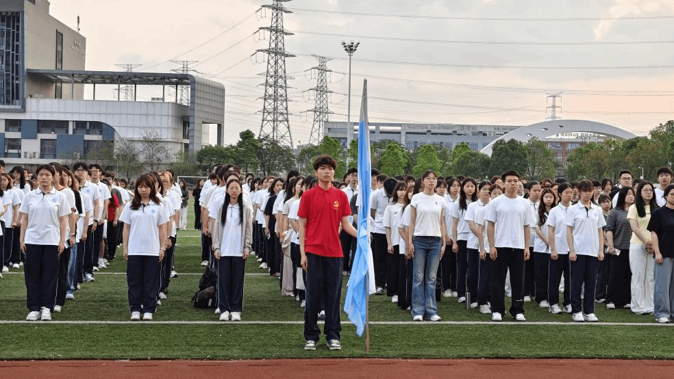 晨光熹微,师生整齐列队、精神昂扬。国旗护卫队铿锵护旗入场,主持人整队肃立。当国歌奏响,红旗冉冉升起,全体师生注目高唱国歌,在庄严时刻凝聚起奋进力量。