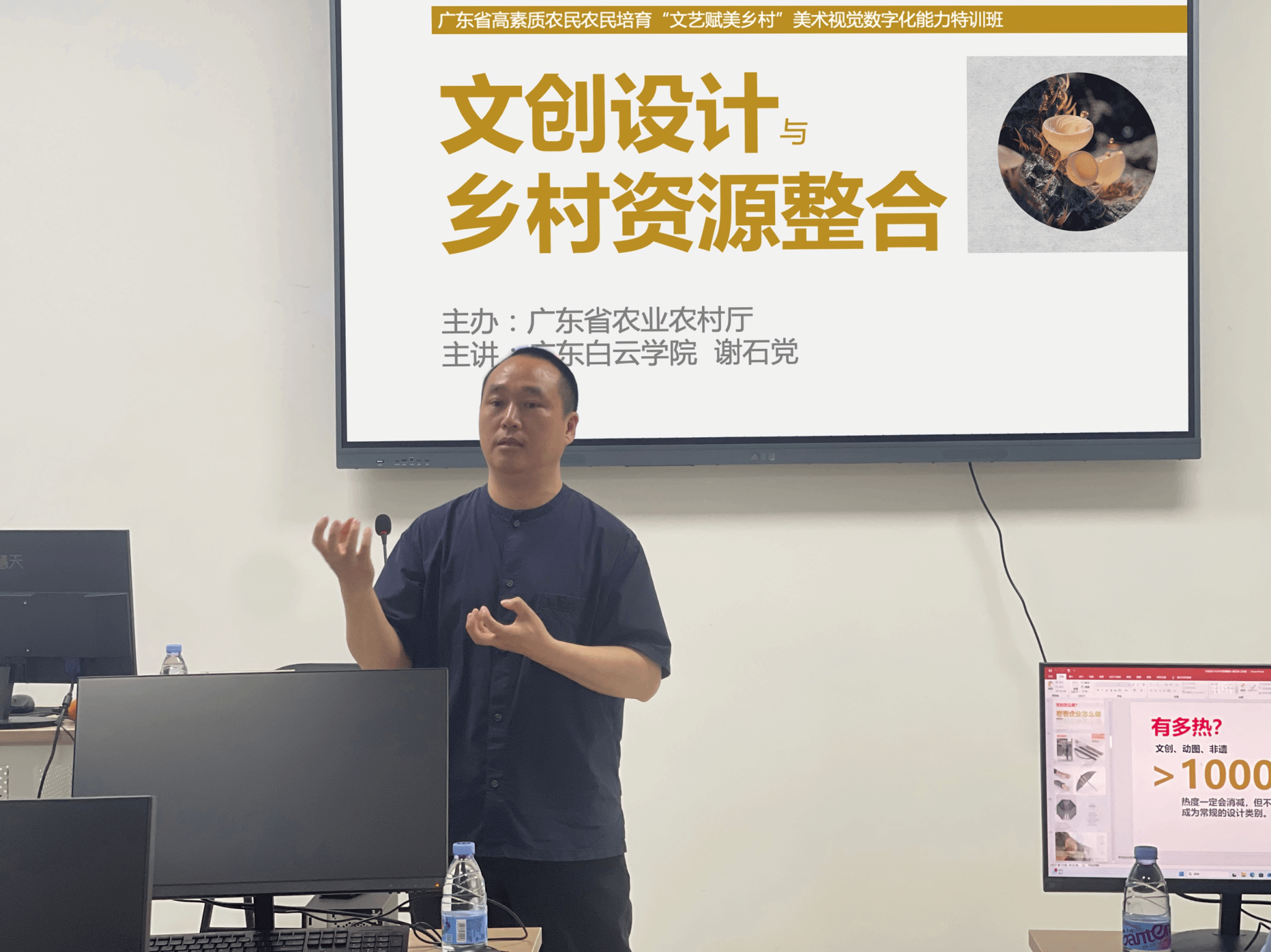 2026年3月23日至4月11日,由广东省农业农村厅主办、广东省现代农业装备研究院承办的广东省“文艺赋美乡村”美术视觉数字化能力特训班在省现代农业装备研究院举办。广东白云学院艺术设计学院教授谢石党受邀为特训班讲课。