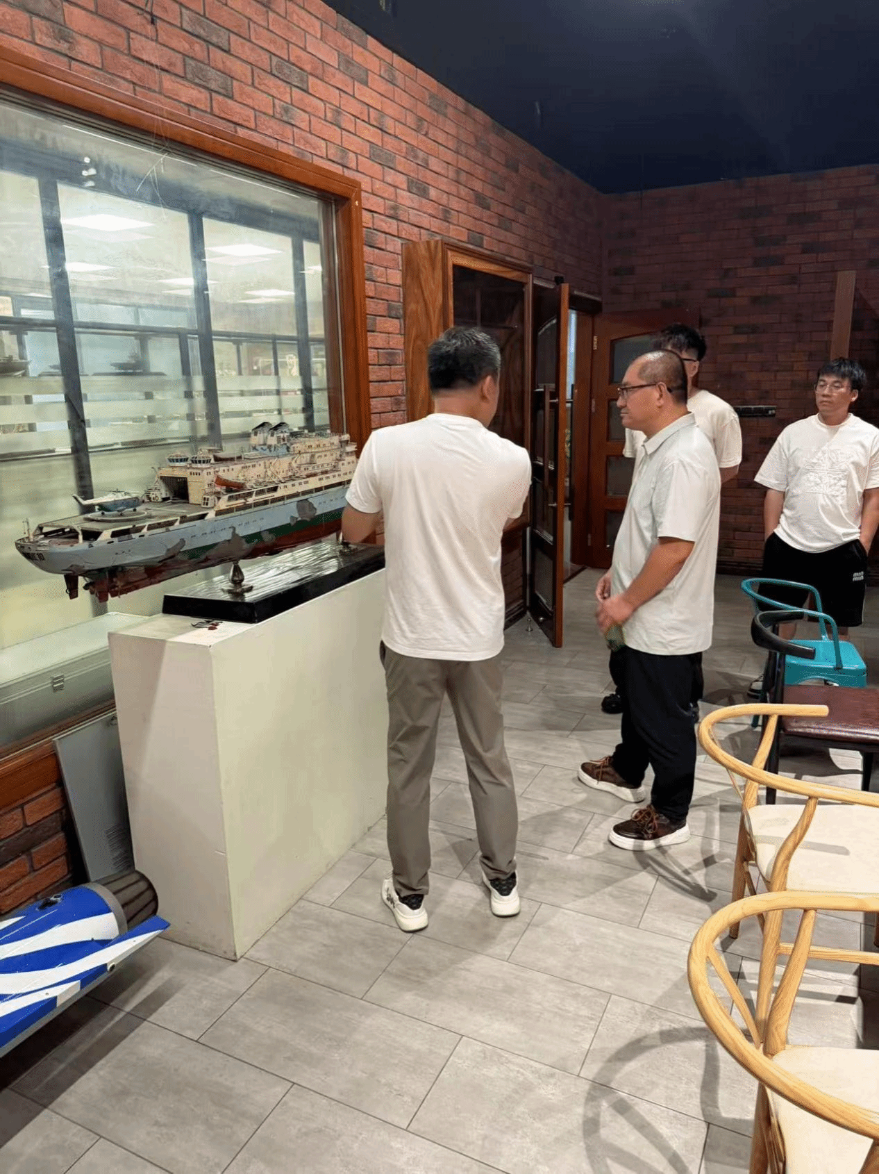 方建松院长一行在佛山市天捷模型有限公司总经理梁杰峰的陪同下,首先参观了公司的展厅与生产车间。天捷模型作为国内仿真船模的佼佼者,其产品涵盖了从博物馆珍藏级的现代级驱逐舰、航空母舰,到民用的集装箱货船、豪华游艇等全系列模型。现场展示的“海洋石油121”“近海拖船(全回旋推进系统)”以及“MT6027潜水支持船”等高精度模型,充分展现了企业在仿真效果、传动系统及后推进侧推进动力系统方面的顶尖工艺。