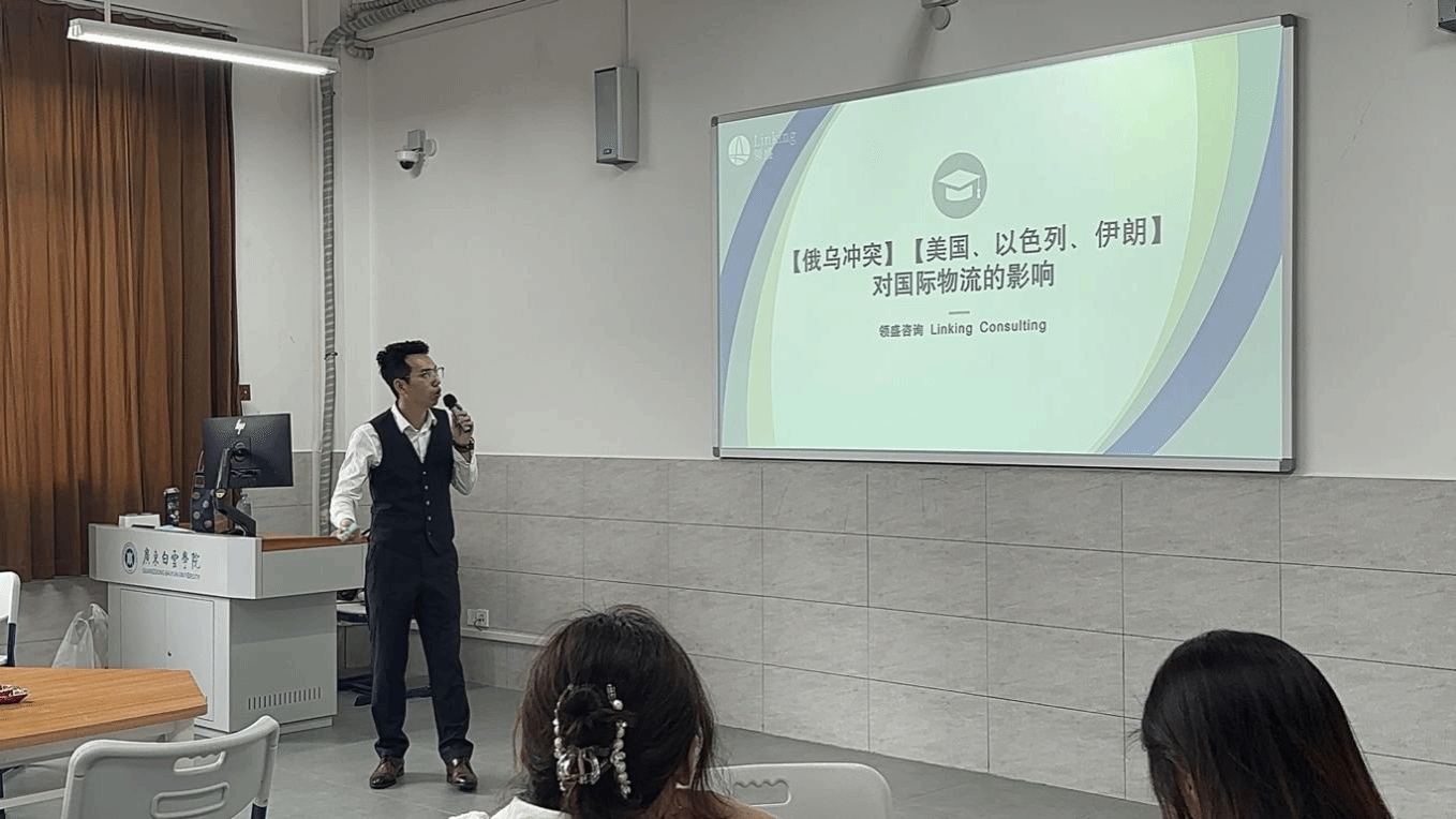4月16日下午,工商管理学院在笃行楼402室成功举办第十六期“数智化供应链产业学院总裁工作坊”交流活动。本次活动的主题是“企业出海浪潮来临,人工智能与国际物流并行”,特邀一带一路企业咨询师、广东进出口商会出海顾问、广州潮汕商会出海顾问,同时也是广东领盛国际货运代理有限公司(以下简称为“领盛”)的副总经理王宏彦先生担任主讲嘉宾,物流管理系系主任高爱、何思劲博士、殷悦老师以及物流管理系、工商管理系等相关专业的学生共同参与。