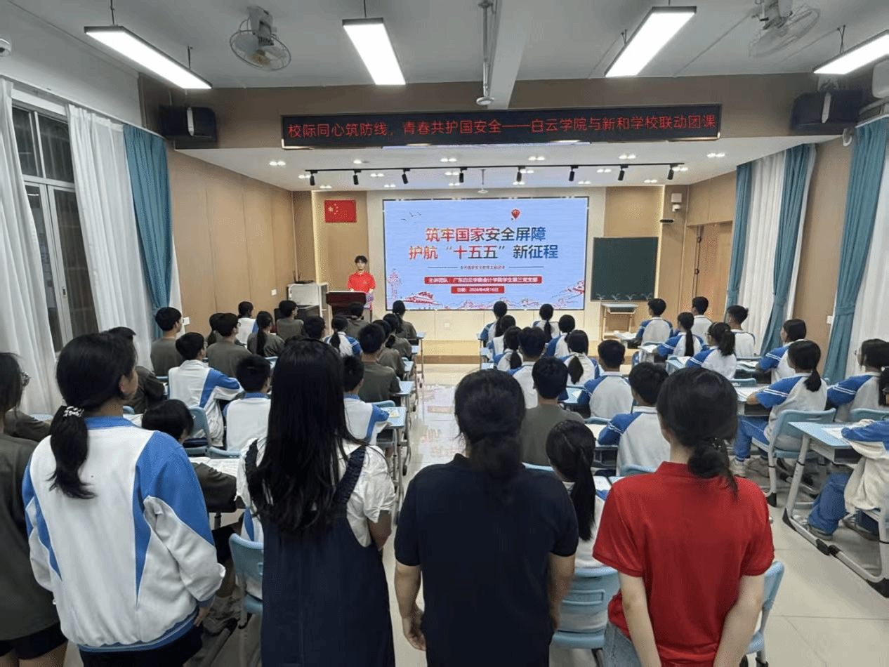 为深入践行总体国家安全观,发挥国家安全教育党员示范引领作用,2025年4月16日下午,广东白云学院会计学院学生第三党支部在党支部书记文雅老师带队下,前往广州市白云区钟落潭镇新和学校,为入团初中生上了一堂以“筑牢国家安全屏障,护航‘十五五’新征程” 为主题的国家安全教育团课,进一步筑牢青少年的思想安全防线。