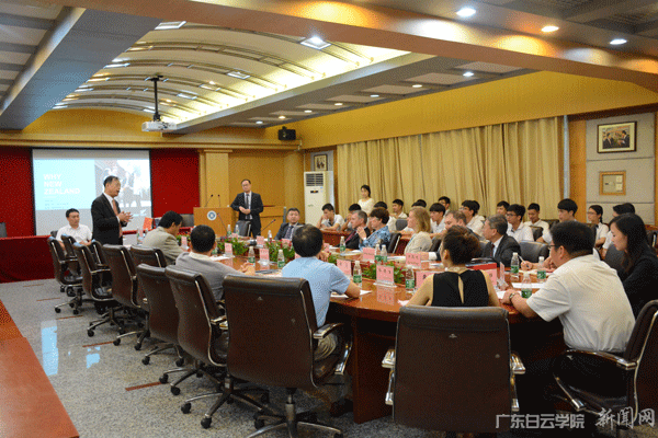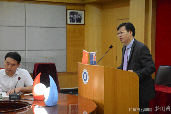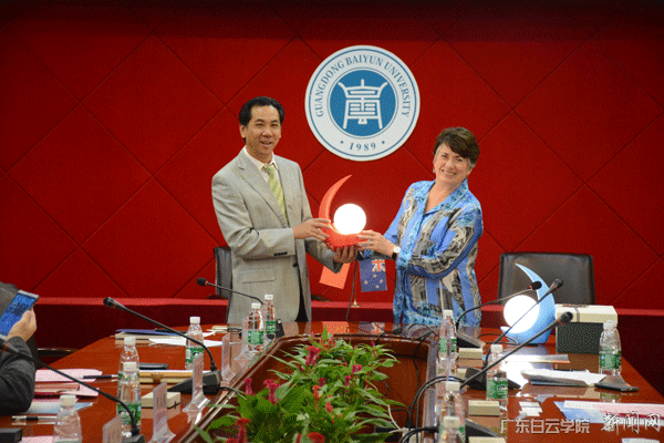 黄大乾校长首先致欢迎词,向来宾介绍了我校的办学历史和学校特色,表示我校与惠灵顿理工大学都是应用技术型大学,都是培养应用技术型人才,都是以理工科专业为主学科,都是坚持产教研和校企业合作的教学模式,都是定位于服务当地社会经济发展,深信两校具有宽广的合作前景。福兰·瓦尔德女士答词表示,惠灵顿理工学院与广东白云学院合作,在办学理念、人才培养地位、教学模式等许多方面具有共同点,两校也有许多各自的比较优势可以相互分享,特别是广东白云学院的“3+1”教学模式和丰富的合作企业资源。何爱梅副总领事在致辞中介绍, 新西兰具有优质的教育体制,中国学生在新西兰获得高质量的留学和生活体验,表示领馆将持续支持两国高校之间的教育合作。周国平副处长介绍了广东省教育发展情况和国际教育合作形势,认为广东白云学院与新西兰惠林顿理工学院在工程教育方面的合作、联合培养应用技术人才,符合广东省国际教育合作的方向。