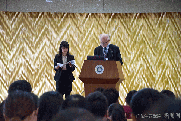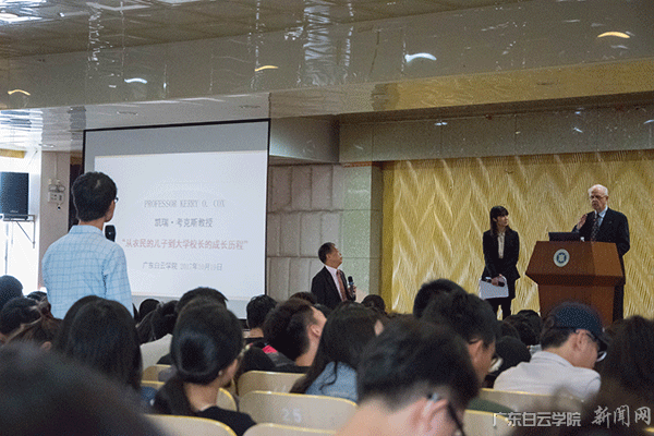 讲座中,凯瑞·考克斯教授以“从一个农民的儿子到大学校长的成长历程”为题,给我们讲述了他60年来的经历。他认为人生中最重要的就是:Keep Learning for Whole Life(活到老学到老),同时给予广东白云学院的学子们一些建议,如:学习上需确定目标,管理好自己的时间,做好充足的准备,学会从错误中学习正确的事情;交往上应小心受骗,欲交友必先成其友等等宝贵的人生学习经验,考克斯教授希望同学们能够树立自己的目标并能坚持走下去,在大学里不仅能得到学习上的进步,更能提升自我,期望同学们能有一个美好的大学生活。