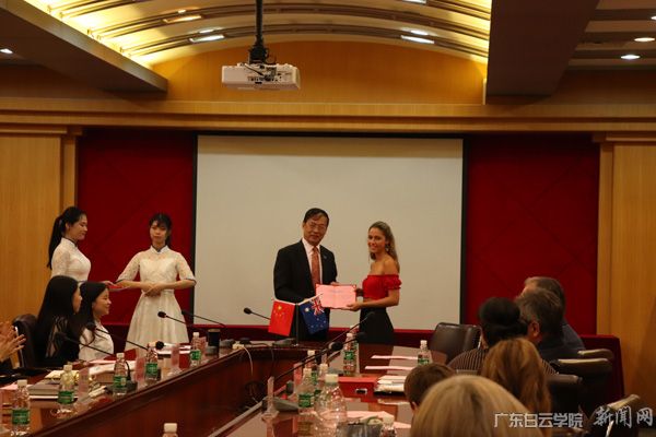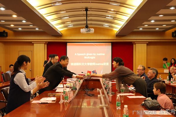 澳大利亚埃迪斯科文大学人文艺术学院Justine教授(右)赠礼于沈根生副校长(左)