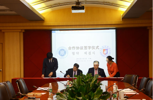 副校长沈根生教授代表学校接待了金道宗校长一行。双方经过深入探讨,就2+2学分互认双学士学位、3+1境外交流学习、3+1+2本硕连读等项目签署了合作协议,并将在教师交流、学术交流、合作课程和合作办学(建立圆光大学广东白云分校)等方面进行了讨论。