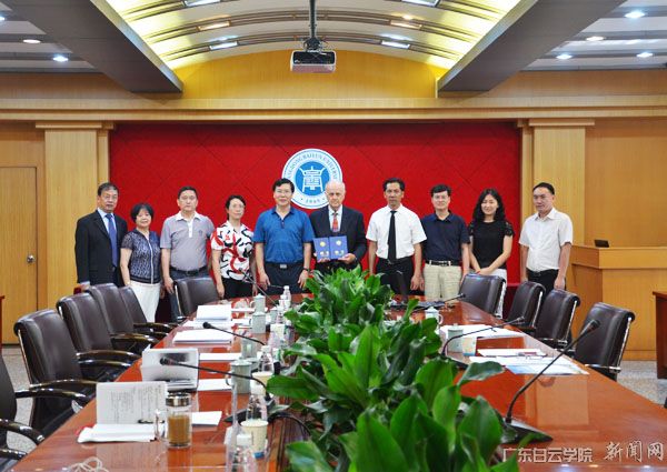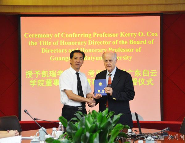 黄大乾校长代表学校表示热烈欢迎考克斯教授来访。他宣布,为了按国际教育理念来研讨和制定“应用技术大学十三五规划”,我校董事会决定聘请澳大利亚应用型大学前校长凯瑞·考克斯教授为广东白云学院荣誉董事和荣誉教授。在荣誉授予仪式上,谢可滔董事长授予考克斯教授为广东白云学院荣誉董事证书。黄大乾校长授予考克斯教授为广东白云学院荣誉教授证书。