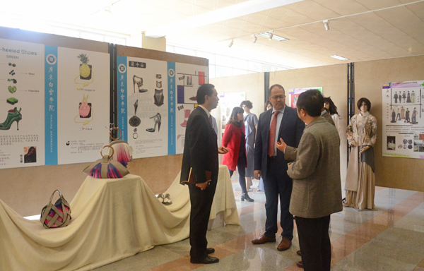 谢可滔董事长(左一)陪同来宾参观学生创新创意作品展