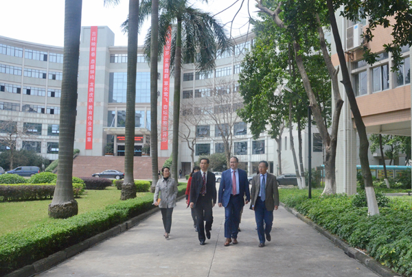 谢可滔董事长(左二)、谢少华副董事长(左一)陪同来宾参观校园