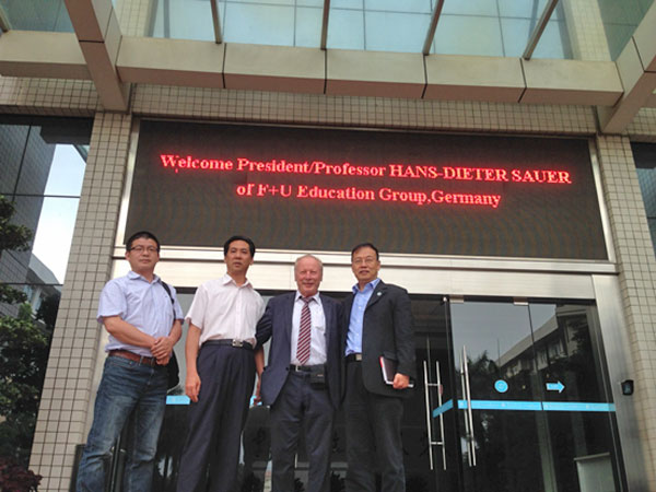 6月2日,德国F+U国际教育集团总裁汉斯-蒂德·索尔先生及亚洲区国际项目经理熊火金博士广东白云学院访问,受到学校董事长谢可滔等热烈欢迎。谢可滔董事长与索尔先生进行了深入的会谈,副校长沈根生、外国语学院副院长沈纯琼和国际交流处张晓会参加了会谈。